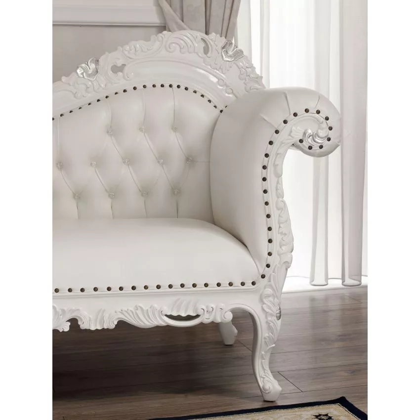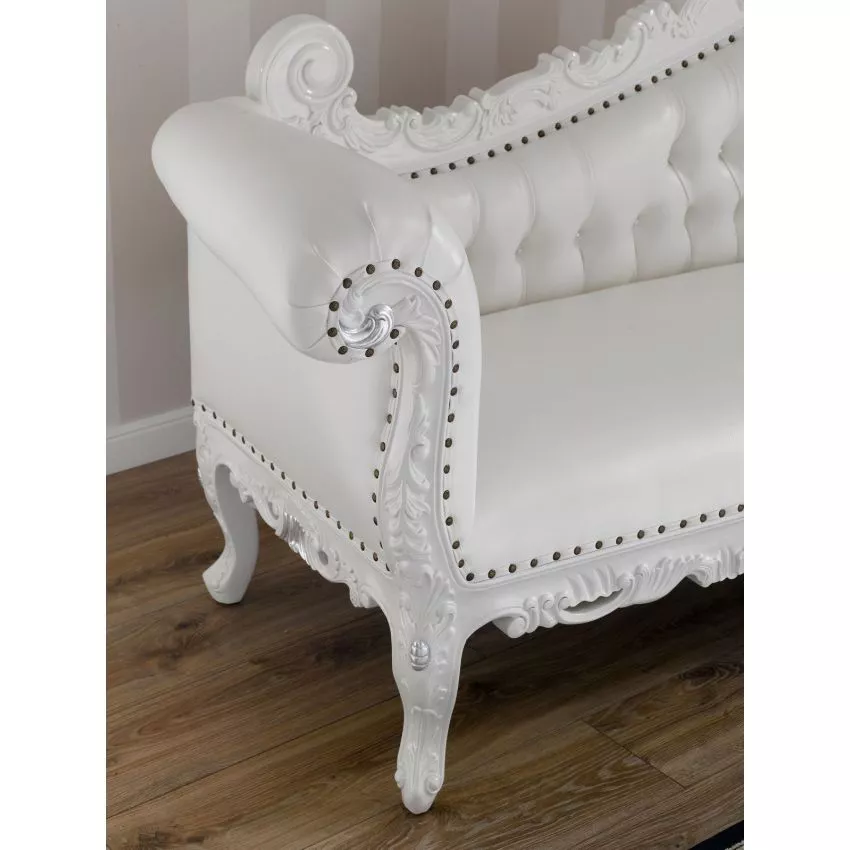 Alejandra Hand Carved Teak Wood Leatherette 3-Seater Chaise Longue Sofa White and Silver Leaf
