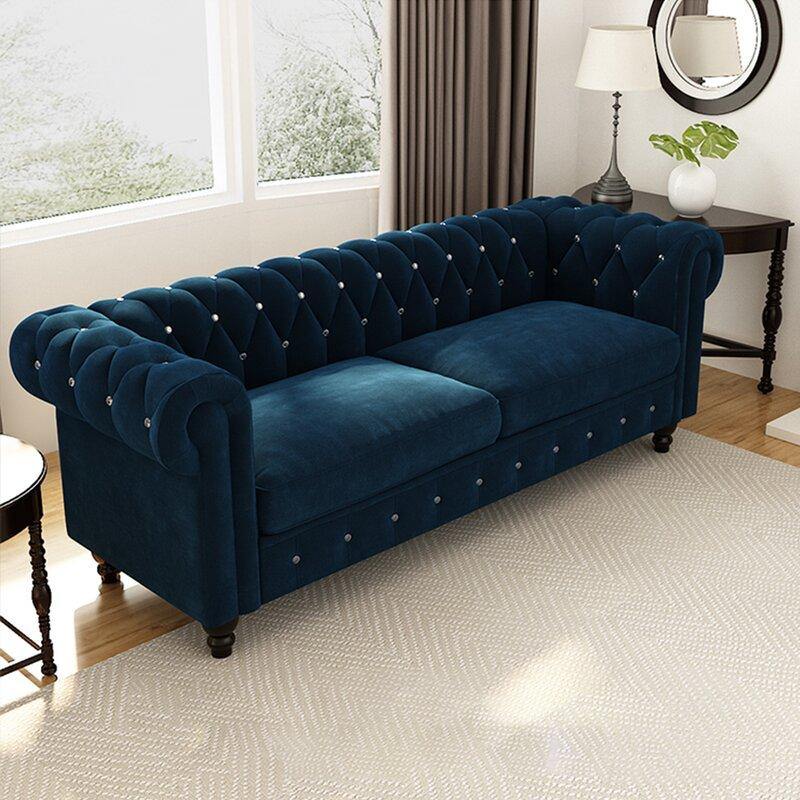 Graceful 3-Seater Velvet Fabric Button Tufted Rolled Arm Chesterfield Sofa ( Blue )