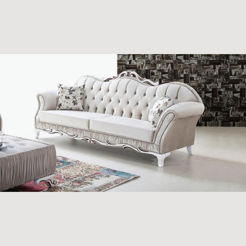 Transform your living space with the Hand Carved Estilo Tufted Teak Wood 3 Seater Sofa Set in elegant silver. This sofa set combines timeless elegance with modern comfort, making it the perfect centerpiece for any living room. Crafted from premium quality teak wood, this hand-carved masterpiece boasts a luxurious tufted backrest, offering both style and support. The durable teak wood frame ensures long-lasting durability, while the intricately carved details provide a sophisticated touch. Perfect for those who appreciate fine craftsmanship and exquisite design, this 3 seater sofa set is designed to elevate your home’s aesthetic appeal.