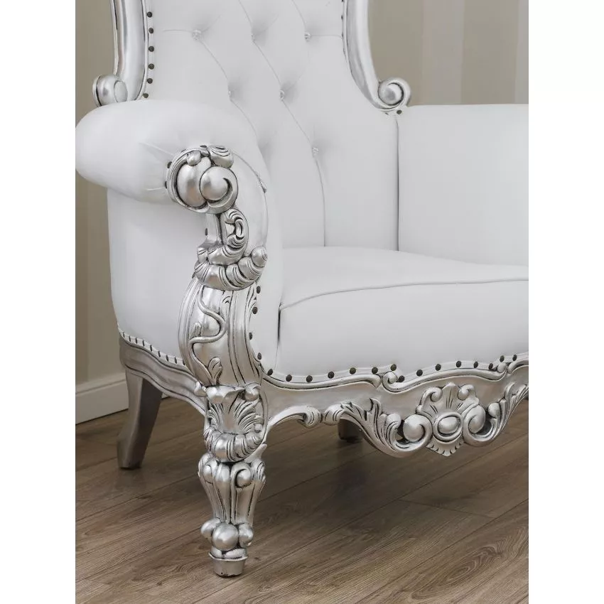 Bring elegance and royalty into your space with the Natural Art & Crafts Luxurious Teak Wood High Back Throne Chair. Meticulously crafted from premium teak wood and finished in a stunning silver, this throne chair is designed to command attention and elevate your home decor. Upholstered with faux leather, it combines classic Baroque charm with modern comfort, making it an ideal statement piece for living rooms, offices, or grand events like weddings. The high-back design offers ultimate support while enhancing the luxurious feel, perfect for those seeking a unique and bold furniture addition.