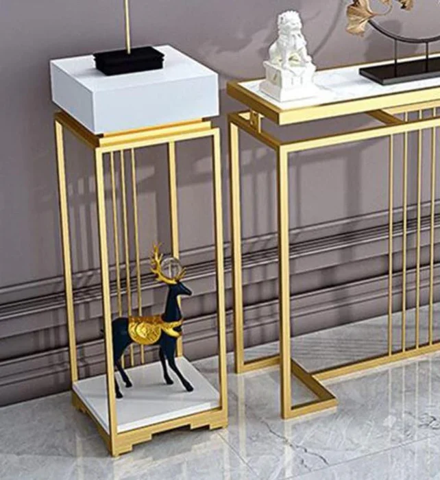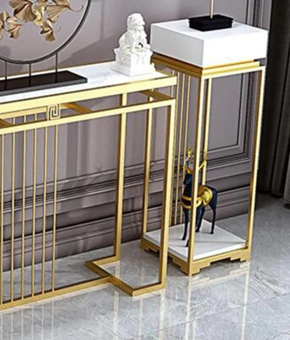 Upgrade your home décor with the Natural Art & Crafts Modern Design Golden Console Table Set of 3. These sleek and stylish console tables feature an iron frame with a luxurious golden finish, perfectly complementing the marble-like tops. Ideal for any entryway, foyer, or living room, these tables create a stunning focal point and offer versatile use, whether for displaying decorative items, holding essentials, or as an accent piece to elevate your interior.
