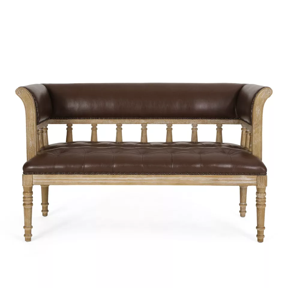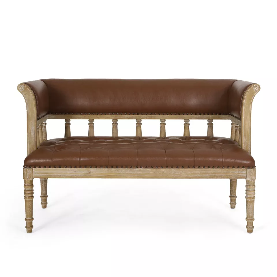 Transform your living space with the Natural Art & Craft Loveseat. This elegant two-seater bench features a button-tufted design and luxurious leatherette upholstery, making it a stylish addition to any room. The sturdy teak wood frame provides both durability and classic charm, while the plush cushioning ensures maximum comfort. Perfect for enhancing your living room or bedroom, this modern loveseat combines sophistication and functionality to create a welcoming and refined atmosphere.