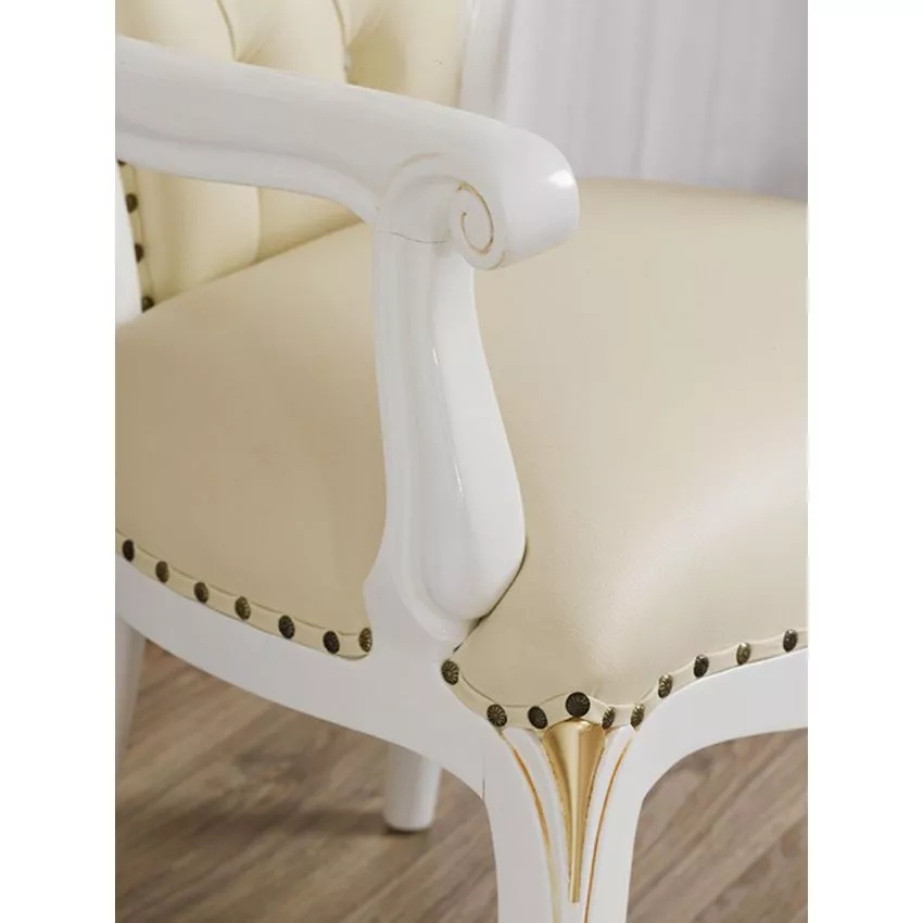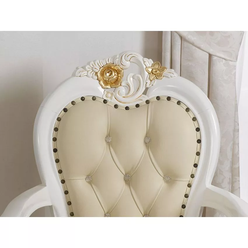 Elevate your space with the Natural Art & Crafts Amalia Hand Carved Baroque Style Armchair, a luxurious statement piece that embodies elegance and grandeur. Meticulously crafted from premium teak wood, this armchair boasts exquisite hand-carved detailing with an intricate baroque design finished in ivory and gold leaf. The champagne faux leather upholstery, adorned with crystal button tufting, adds a touch of sophistication and comfort, making it perfect for living rooms, offices, or as a decorative centerpiece.