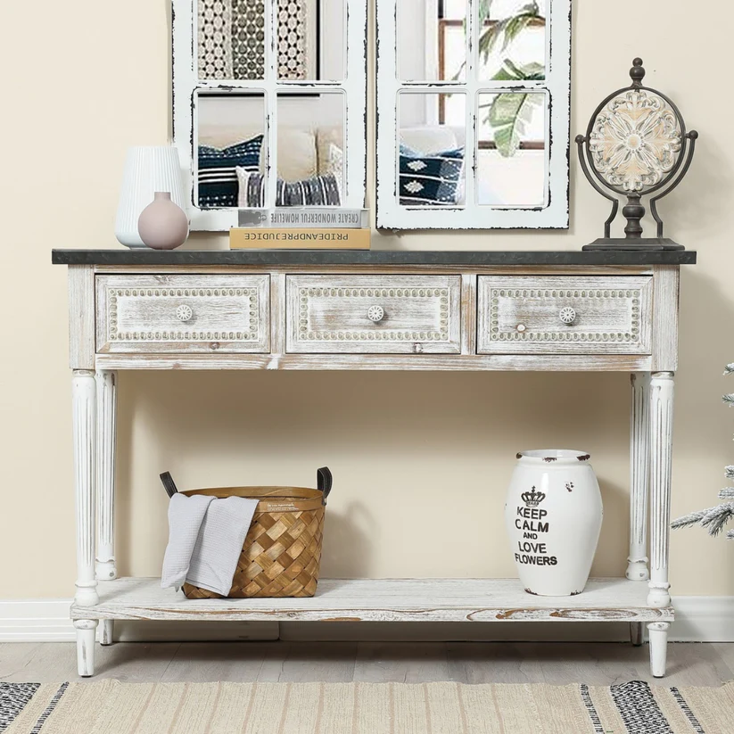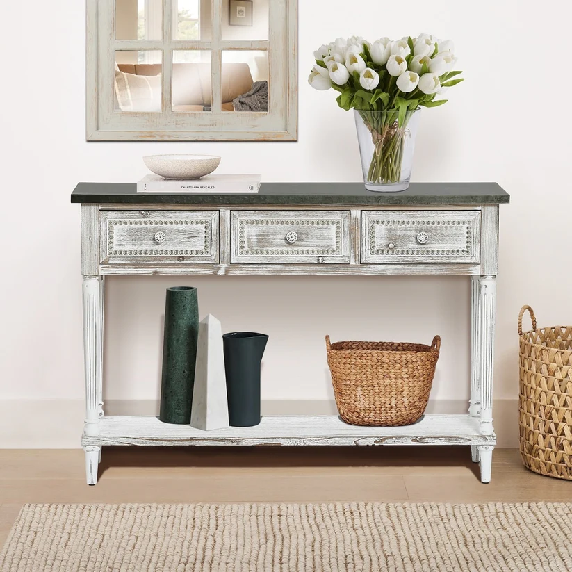 Elevate your home decor with the Natural Art & Crafts Sela Handmade Teak Wood Console Table, beautifully crafted from solid teak wood in an elegant antique white finish. This versatile piece features three spacious drawers and a bottom shelf, offering stylish storage for any room in your home. Its farmhouse and rustic design perfectly complements entryways, hallways, living rooms, or bedrooms. With its compact, narrow structure, this console table maximizes space while adding timeless charm to your interior. Perfect for displaying decor, organizing essentials, or serving as a functional entryway table.
