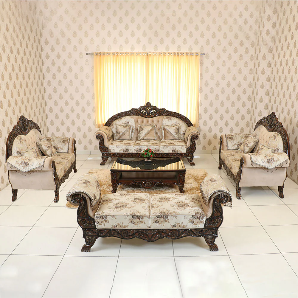 Tragic Hand Carved Teak Wood Sofa Set 3+2+1+1 with Coffee Table Elegant Living Room
