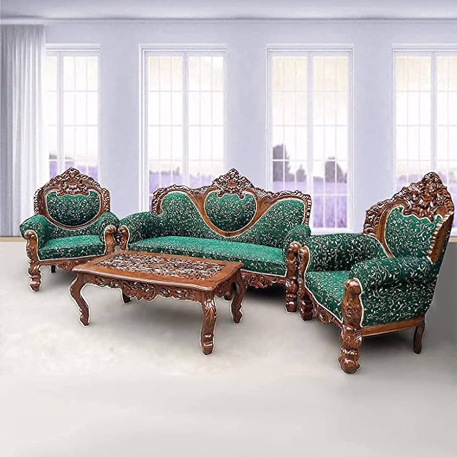 Royal Maharaja Hand Carved Teak Wood Sofa Set 3+2+1 with Coffee Table Traditional Indian Style Living Room Elegant & Durable